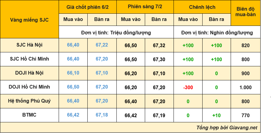 Tại hệ thống Phú Quý, giá mua và bán không thay đổi so với cuối ngày 6/2, giao dịch mua – bán niêm yết tại mốc 66,40 – 67,20 triệu đồng/lượng.