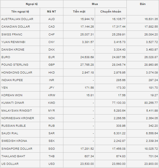 Ngân hàng Vietcombank, niêm yết giao dịch mua – bán ở mốc 23.530 – 23.900 VND/USD, đi ngang chiều mua và bán so với giá chốt phiên trước.