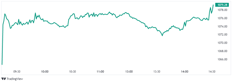 Sau nhịp mở gap tăng điểm đầu phiên, VN-Index diễn biến giằng co trong biên độ hẹp trước khi mở rộng đà tăng hưng phấn đến cuối phiên. Dòng tiền lan toả tích cực đến các nhóm ngành đã giúp cho chỉ số chớm phá ngưỡng cản quan trọng quanh 1.070 và để ngỏ cơ hội mở rộng đà tăng điểm tích cực.