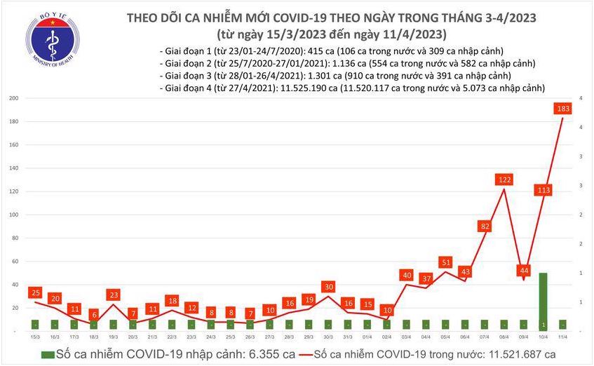 Theo thống kê của Bộ Y tế, số ca mắc Covid-19 trên cả nước đang có dấu hiệu tăng trở lại. Cụ thể, trong ngày 11/4, số ca mắc mới ghi nhận là 183 trường hợp, số ca mắc trong ngày 10/4 là 113 ca và ngày 8/4 là 122 ca.