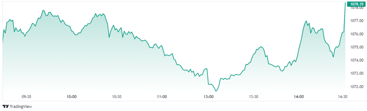 VN-Index giảm điểm giằng co trong phiên trước khi dần hồi phục và tăng nhẹ về cuối phiên. Lực mua chủ động một lần nữa gia tăng quanh ngưỡng hỗ trợ gần 1070 đã giúp cho chỉ số sớm lấy lại đà tăng điểm sau một nhịp điều chỉnh giằng co.