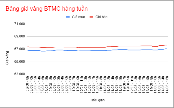 BTMC, niêm yết giao dịch mua – bán ở mốc 67,05 – 67,65 triệu đồng/lượng, tăng 200.000 đồng/lượng chiều mua và 270.000 đồng/lượng chiều bán so với giá mở cửa.