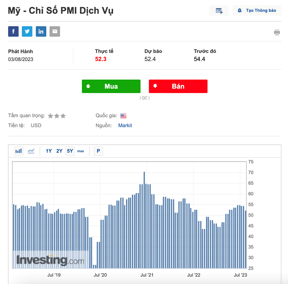 PMI Dịch vụ Hoa Kỳ vào thứ Tư, S&P Global sẽ công bố báo cáo dự báo ban đầu về PMI sản xuất và dịch vụ của Mỹ trong tháng Tám. Trong trường hợp PMI Dịch vụ Hoa Kỳ chính thức giảm dưới mức 50 và cho thấy sự suy giảm trong hoạt động kinh doanh ngành dịch vụ, thì điều này sẽ khiến Đô la Mỹ có thể gặp áp lực và giúp vàng XAU/USD phục hồi.