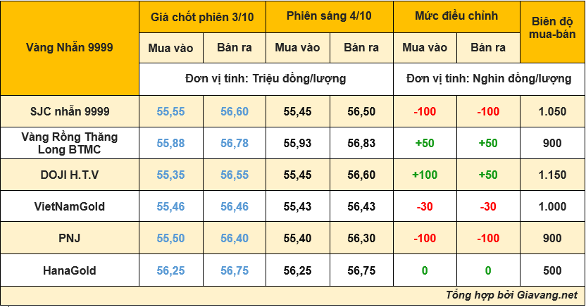 Bảng so sánh giá vàng nhẫn 9999 sáng 4/10