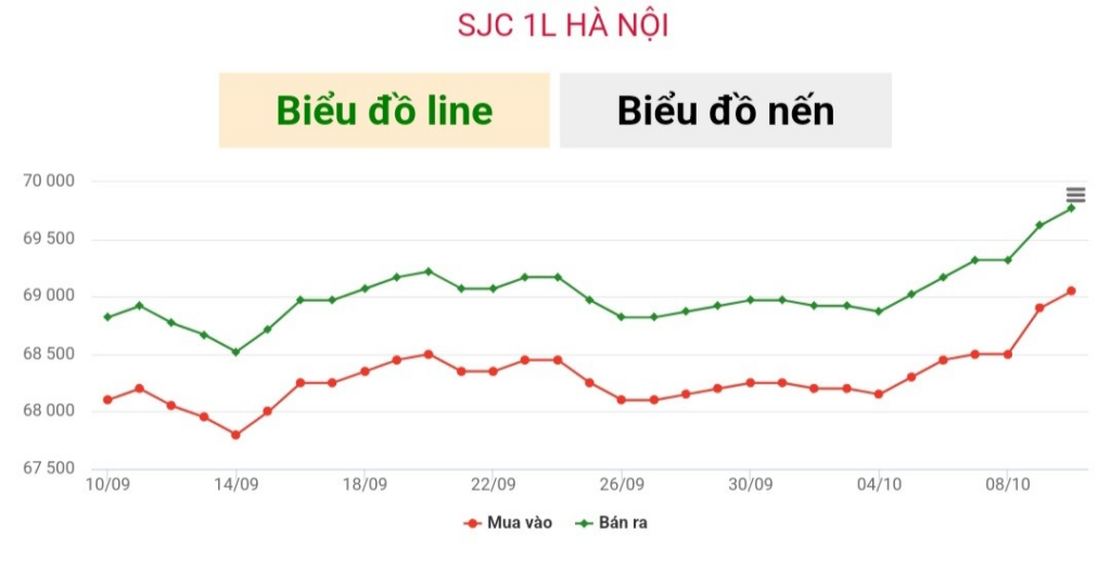Cụ thể, lúc 14h, ngày 10/10, SJC tại Hà Nội được công ty CP SJC Sài Gòn niêm yết giao dịch mua – bán ở mốc 69,05 – 69,77 triệu đồng/lượng, tăng 50.000 đồng/lượng giá mua và bán so với đầu giờ sáng cùng ngày.