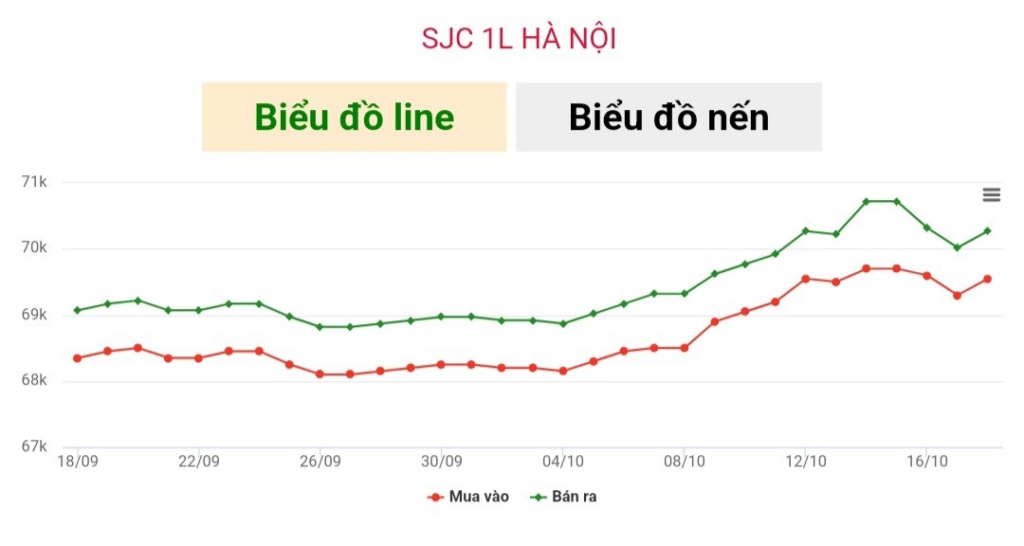 Cập nhật lúc 15h, ngày 18/10, SJC tại Hà Nội niêm yết giao dịch mua – bán ở mốc 69,60 – 70,32 triệu đồng/lượng, tăng 100.000 đồng/lượng giá mua và bán so với thời điểm mở cửa.