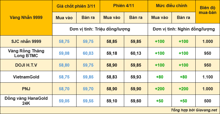 DOJI – nhẫn Hưng Thịnh Vượng 9999, niêm yết giao dịch mua – bán tại mốc 58,90 – 59,85 triệu đồng/lượng, mua vào và bán ra cùng tăng 100.000 đồng/lượng so với chốt phiên 3/11.