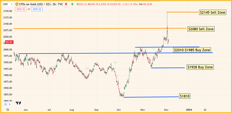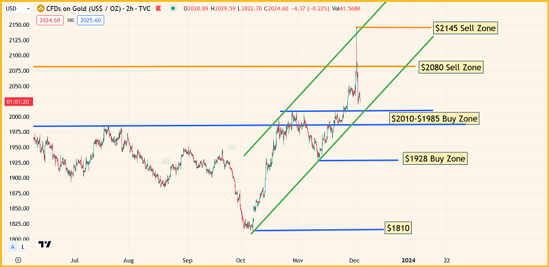 Tôi không phải là người thích các đường xu hướng dốc trên thị trường vàng, nhưng đôi khi chúng rất hữu ích. Hãy lưu ý các đường xu hướng màu xanh lá cây xác định xu hướng tăng không ổn định. Việc giảm xuống đường xu hướng thấp hơn sẽ đưa vàng vào vùng hỗ trợ lớn $2010-$1985. Đó là vùng “phải mua” đối với hầu hết những người đam mê chứng khoán vàng. Tôi gọi nó là chiếc tất vàng cho Giáng sinh năm 2023!.