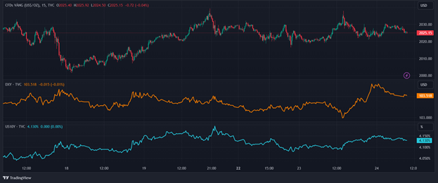 Vì thị trường không có quá nhiều tin tức chi phối nên USD (thông qua chỉ số DXY) và Lợi suất Trái phiếu chính phủ Mỹ kì hạn 10 năm gần như không thay đổi. Chỉ số DXY nhích lên 103,5 trong khi Lợi suất ổn định vùng 4,13%.