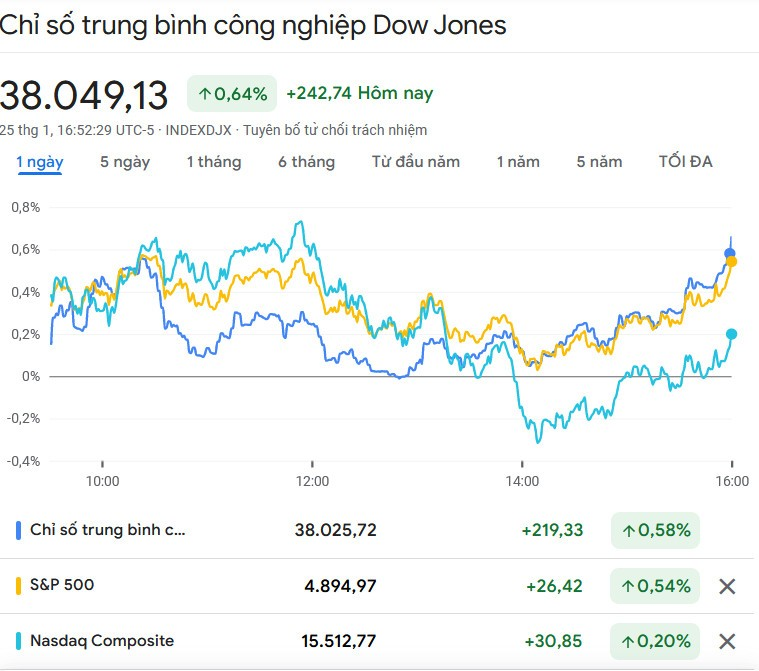 Kết phiên giao dịch thứ Năm 25/1, chỉ số S&P 500 tiến 0,53% lên 4.894,16 điểm, lập kỷ lục mới về mức đóng cửa cao nhất mọi thời đại. Chỉ số Dow Jones cộng 242,74 điểm (tương đương 0,64%) lên 38.049,13 điểm. Chỉ số Nasdaq Composite nhích 0,18% lên 15.510,50 điểm, bị áp lực bởi đà giảm của cổ phiếu Tesla.