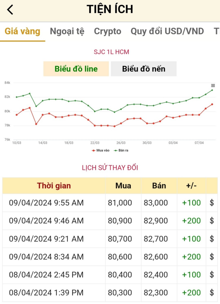- Sáng nay 9/4, thị trường vàng miếng đồng loạt bật tăng và thiết lập đỉnh mới 83 triệu đồng mỗi lượng.