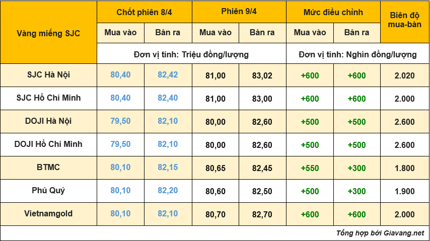 Bảo Tín Minh Châu, niêm yết giao dịch mua – bán ở mức 80,65 – 82,45 triệu đồng/lượng, tăng 550.000 đồng/lượng chiều mua, 300.000 đồng/lượng chiều bán so với chốt phiên 8/4.