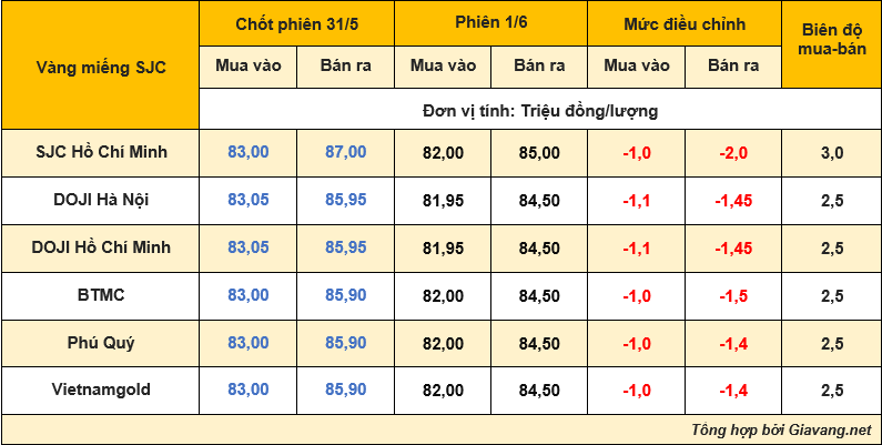Cập nhật lúc 10h, ngày 1/6, SJC Hồ Chí Minh giảm 1 triệu đồng chiều mua và 2 triệu đồng chiều bán so với cuối ngày 31/5, giao dịch mua – bán hạ về 82,00 – 85,00 triệu đồng/lượng.