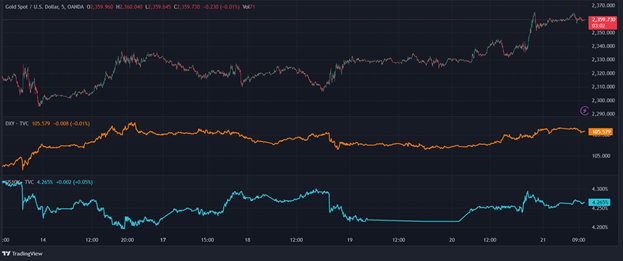 Điểm đáng nhấn mạnh ở đây là việc vàng tăng bất chấp Chỉ số DXY tiếp tục giữ vững mốc 105,5 và hướng lên cao khi Ngân hàng trung ương Thụy Sỹ hạ lãi suất và Ngân hàng trung ương Anh ngụ ý sớm nới lỏng tiền tệ. Lợi suất Trái phiếu chính phủ Mỹ kì hạn 10 năm neo quanh mốc 4,2%.