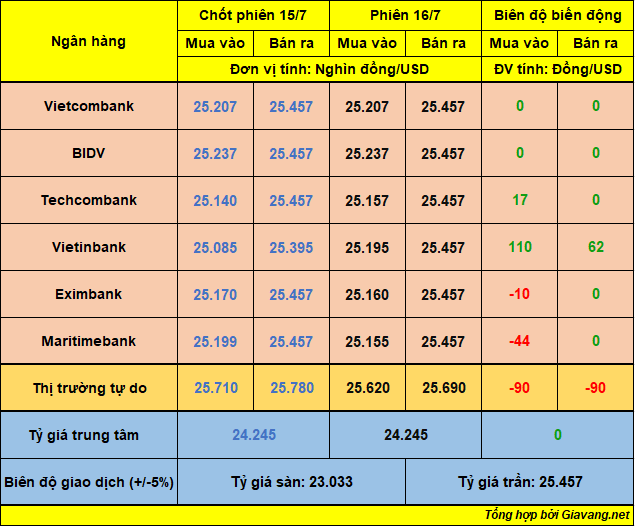 Ngân hàng Vietcombank, niêm yết giao dịch mua – bán ở mốc 25.207 – 25.457 VND/USD, giá mua và bán đi ngang so với chốt phiên 15/7.