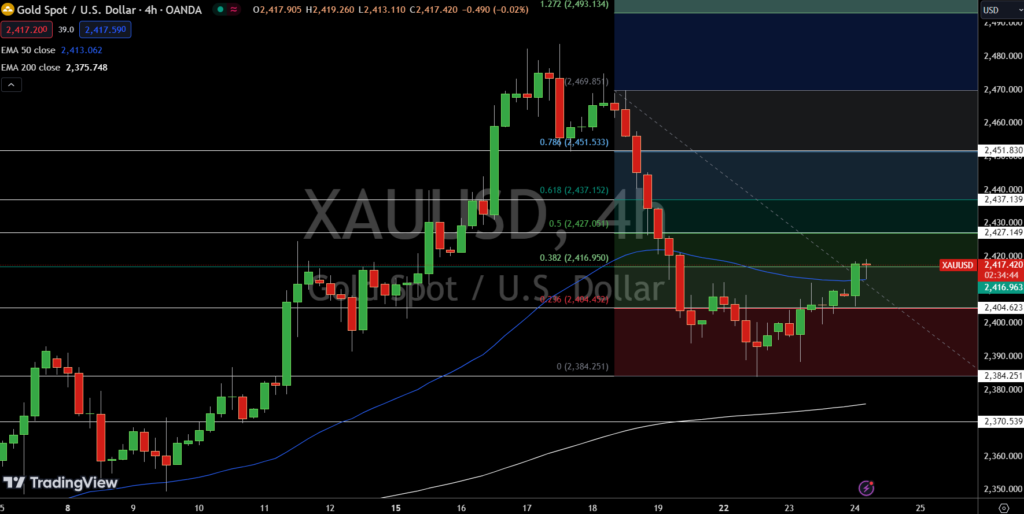 - Kháng cự: $2427,15 – $2437,14 và $2451,83, cho thấy tiềm năng chuyển động đi lên nếu các mức này bị vi phạm.