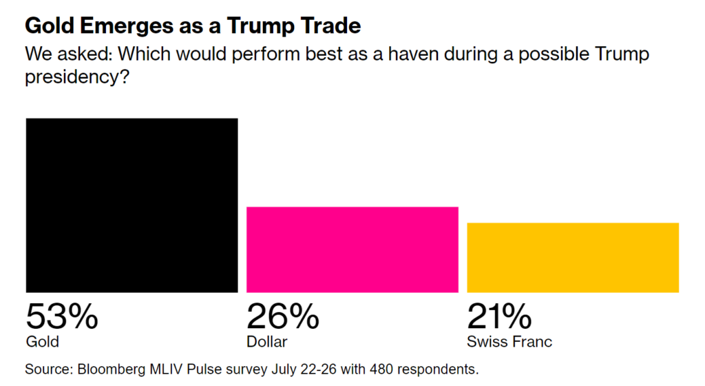 Những người ủng hộ kim loại quý như một nơi trú ẩn trong trường hợp ông Trump tái đắc cử đông hơn gấp đôi những người chọn đồng đô la Mỹ trong số 480 người được hỏi. Hơn 60% số người được khảo sát cho rằng đồng bạc xanh cuối cùng sẽ suy yếu trong trường hợp ứng cử viên đảng Cộng hòa giành được nhiệm kì Tổng thống tiếp theo