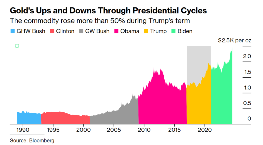 Mặc dù mức tăng mạnh nhất của vàng dưới thời Trump diễn ra vào năm 2020 khi các nhà đầu tư tìm nơi trú ẩn an toàn trong đại dịch Covid-19 xảy ra một lần duy nhất, báo cáo lưu ý rằng đây “thậm chí không phải là đợt tăng giá lớn nhất dưới thời một Tổng thống mà chúng ta từng thấy trong 50 năm qua” vì mức tăng giá dưới thời ông George W. Bush và Jimmy Carter thậm chí còn lớn hơn.