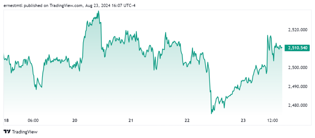 Sau khi đạt đỉnh gần $2517/oz lúc 11:00 sáng theo giờ miền Đông Hoa Kỳ, giá vàng ổn định trong phạm vi hẹp quanh $2510 và đóng tuần ở vùng giá này.