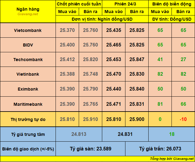 Hôm nay (24/3) Ngân hàng Nhà nước công bố tỷ giá trung tâm cặp đồng tiền VND/USD được áp dụng trong ngày ở mức 24.831 VND/USD, tăng 18 đồng so với niêm yết trước. Với biên độ +/-5% theo quy định, tỷ giá sàn hiện là 23.589 VND/USD, tỷ giá trần là 26.073 VND/USD.