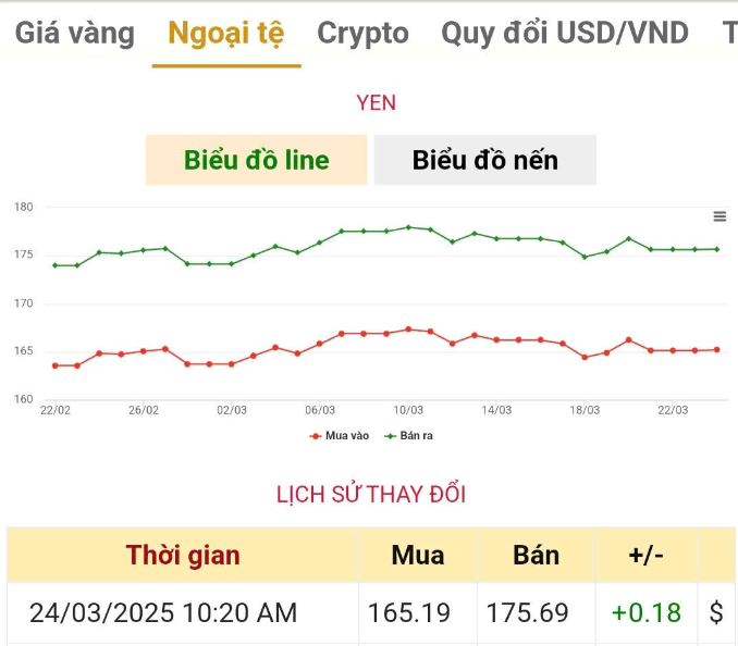 Vietcombank, niêm yết giao dịch mua – bán ở mức 165,19 – 175,69 VND/JPY, tăng 0,06 đồng chiều mua và bán so với giá chốt phiên trước.