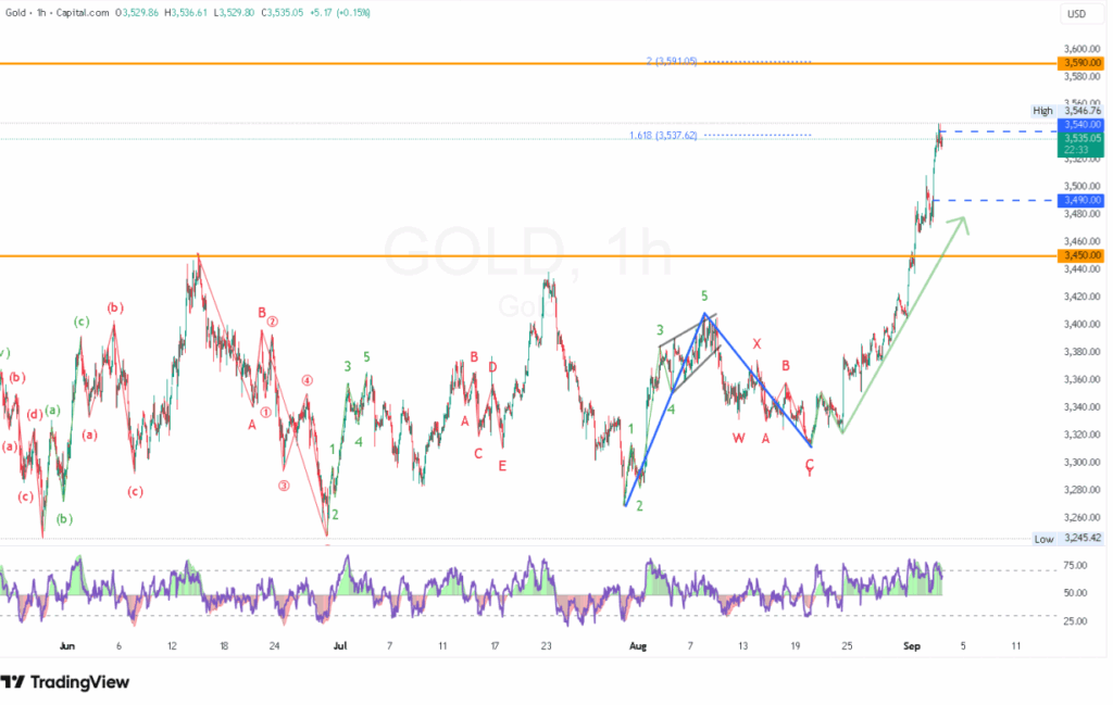 • Mục tiêu ngắn hạn: $3540 và $3590 theo các mốc Fibonacci Extension.