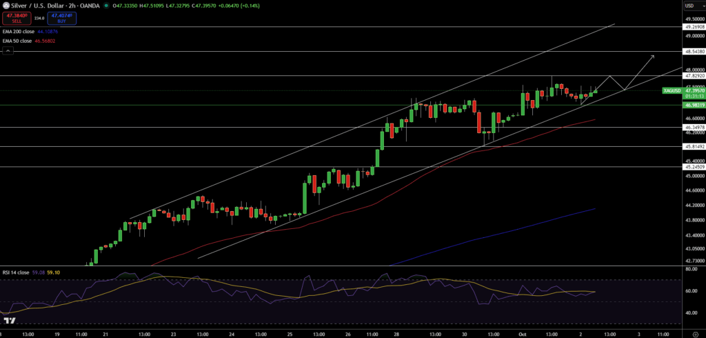 Bạc dao động trong kênh tăng giá, được hỗ trợ bởi EMA 50 tại 46,56 USD và EMA 200 tại 44,10 USD. RSI ở mức 59 phản ánh lực mua bền vững. Miễn là bạc giữ trên 46,34 USD, xu hướng tăng ngắn hạn vẫn được duy trì, với các chiến lược mua khi giá điều chỉnh được ưu tiên.