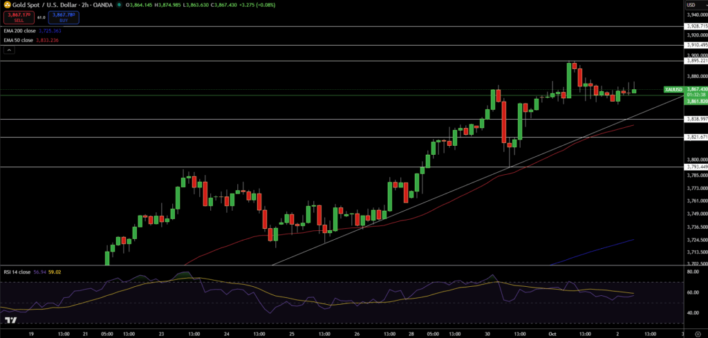 Vàng tiếp tục được hỗ trợ bởi đường xu hướng tăng và đường EMA 50 ngày tại 3.833 USD. Chỉ báo RSI ở mức 58 cho thấy lực mua duy trì nhưng chưa quá nóng. Ngưỡng kháng cự quan trọng nằm tại 3.895 – 3.928 USD, nếu vượt qua có thể mở rộng đà tăng.