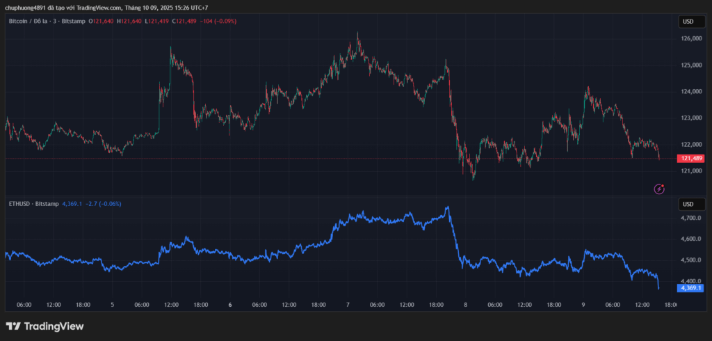Thị trường tiền kĩ thuật số tiếp tục giảm dưới đỉnh kỉ lục. BTC/USD lùi về 121.000. ETH/USD giảm về dưới 4400.