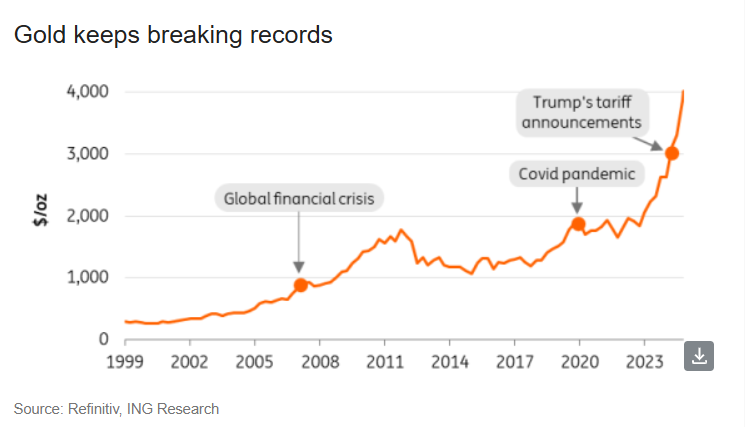Ngày 8/10, vàng đã lần đầu tiên phá vỡ mốc 4.000 USD/oz, được thúc đẩy bởi lo ngại về tình hình kinh tế Mỹ và nguy cơ chính phủ đóng cửa (shutdown) kéo dài. Đợt tăng này đã giúp giá vàng tăng hơn 50% kể từ đầu năm, khiến nhiều tổ chức tài chính lớn, trong đó có ING, phải điều chỉnh lại dự báo.
