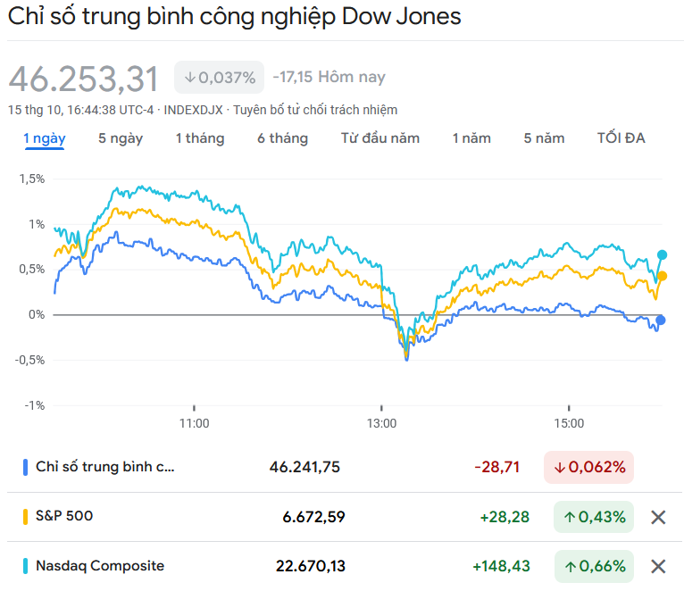 Đóng cửa phiên giao dịch thứ Tư ngày 15/10, chỉ số Dow Jones hầu như không thay đổi, chỉ hạ 17,15 điểm (tương đương 0,04%) xuống 46.253,31 điểm. Có thời điểm, chỉ số này tăng tới 422,88 điểm.
