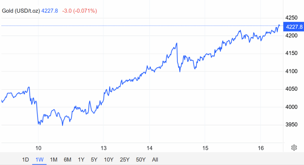 Kết thúc phiên giao dịch ngày 15/10, hợp đồng vàng giao ngay tiến 1,3% lên $4193,39/oz, sau khi đạt mức cao mọi thời đại là $4217,95/oz trước đó.