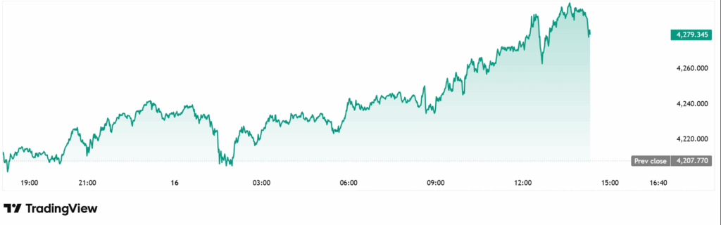 Giá vàng giao ngay (spot gold) tiếp tục tăng mạnh trong phiên thứ Năm, đạt mức kỷ lục mới 4.298,72 USD/oz lúc 1:37 chiều (giờ EDT), trước khi chốt phiên quanh 4.279,73 USD/oz, tăng 1,71% so với ngày trước đó.