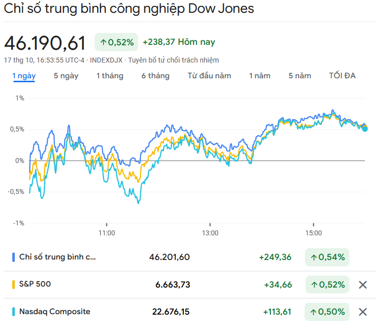 Đóng cửa phiên giao dịch thứ Sáu ngày 17/10, chỉ số Dow Jones tăng 238,37 điểm (tương đương 0,52%) lên 46.190,61 điểm.