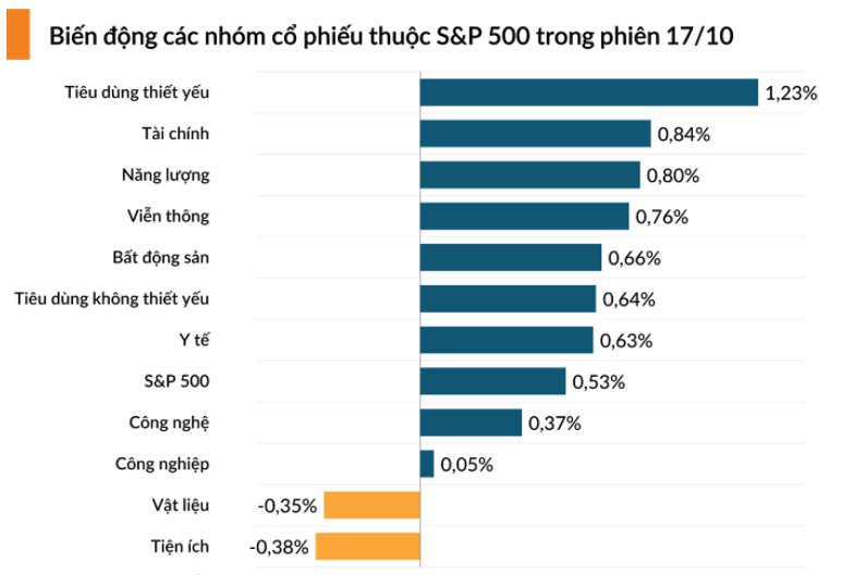 Bảng điện tử S&P 500 ghi nhận sắc xanh trở lại với 9/11 nhóm ngành. Cổ phiếu Tiêu dùng thiết yếu – Tài chính – Năng lượng hồi phục tốt nhất.