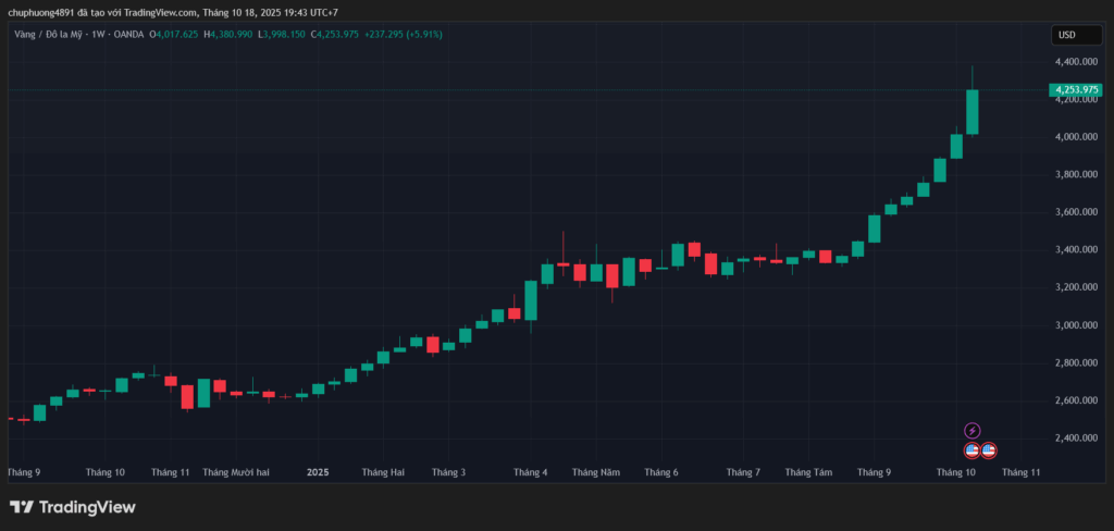 (GVNET) Thị trường vàng toàn cầu đang khép lại tuần giao dịch thứ 9 liên tiếp trong sắc xanh – một thành tích hiếm có chỉ năm lần xuất hiện kể từ thập niên 1970. Tuy nhiên, đà tăng có dấu hiệu chững lại khi kim loại quý này ghi nhận mức giảm gần 2% trong phiên thứ Sáu, dù tính chung cả tuần vẫn tăng 5%.