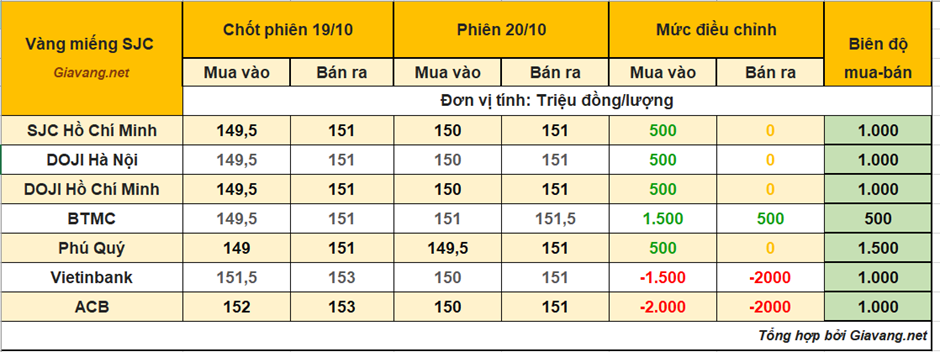 DOJI Hà Nội và Hồ Chí Minh, niêm yết giao dịch mua – bán ở mức 150 – 151 triệu đồng/lượng, giá mua tăng 500 nghìn đồng mỗi lượng và giá bán không đổi so với giá chốt phiên 19/10.