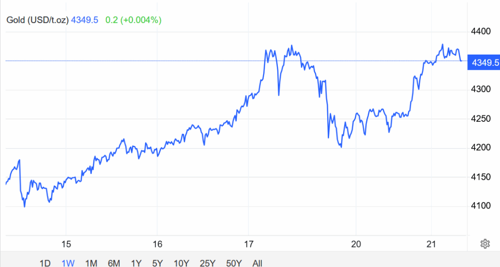 Kết thúc phiên giao dịch ngày 20/10, hợp đồng vàng giao ngay tiến 2,3% lên $4347,47/oz.