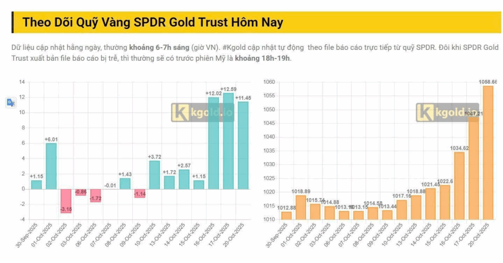 Quỹ tín thác vàng hàng đầu thế giới SPDR Gold Trust tiếp tục mua vào 11,45 tấn vàng trong ngày thứ Hai. Theo đó, lượng vàng nắm giữ của quỹ tăng tăng lên mức 1058,66 tấn vào cuối ngày 20/10.