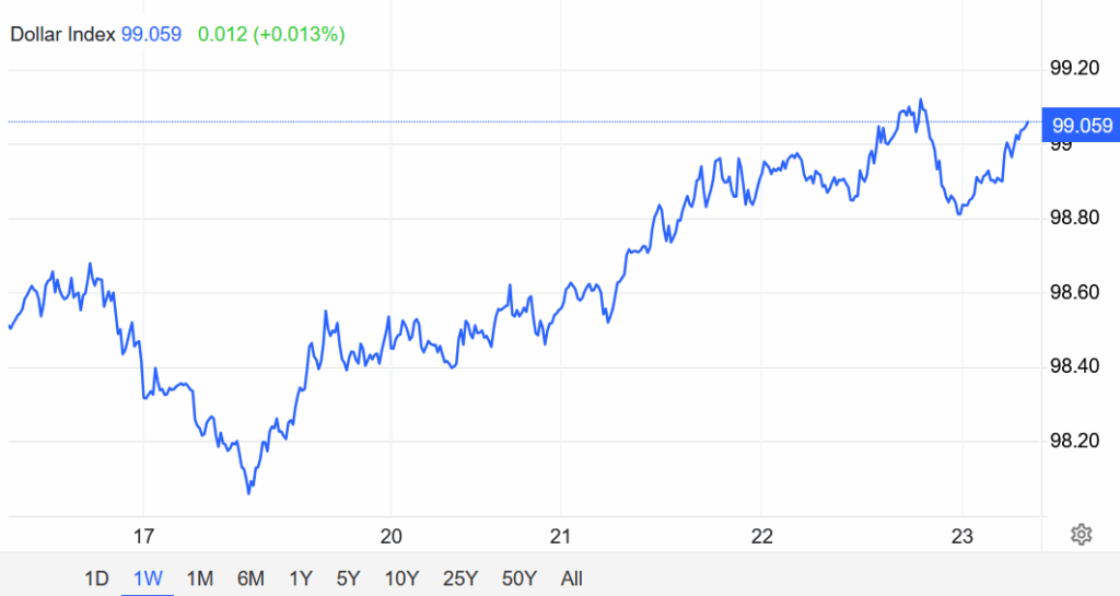 Chỉ số đô la Mỹ DXY đã có lúc tăng vượt mốc 99 vào ngày thứ Tư, nhưng sau đó thu hẹp đà tăng và dao động quanh mức 98,9, sau ba phiên tăng liên tiếp. Đồng bạc xanh ban đầu được hỗ trợ nhờ đồng bảng Anh suy yếu, khi dữ liệu lạm phát của Vương quốc Anh thấp hơn kỳ vọng, làm gia tăng dự báo Ngân hàng Trung ương Anh (BoE) sẽ cắt giảm lãi suất.