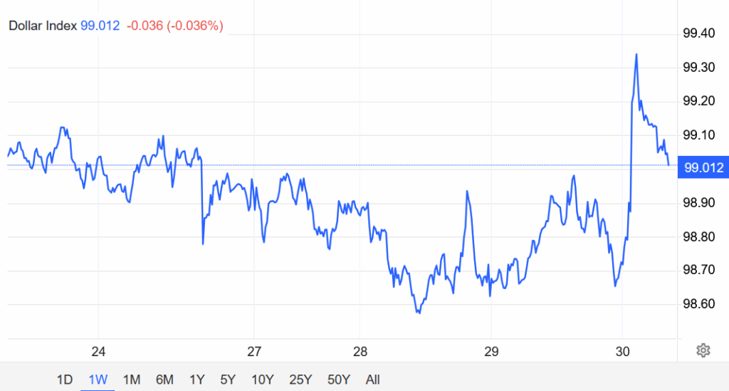 Chỉ số đô la Mỹ DXY đã mở rộng mức tăng lên trên 99,3 vào thứ Tư, mức cao nhất kể từ giữa tháng, sau khi Fed thực hiện cắt giảm lãi suất 25 điểm cơ bản như dự kiến, nhưng trong cuộc họp báo thường kỳ, Chủ tịch Powell cho biết việc cắt giảm lãi suất vào tháng 12 không phải là một kết luận chắc chắn.