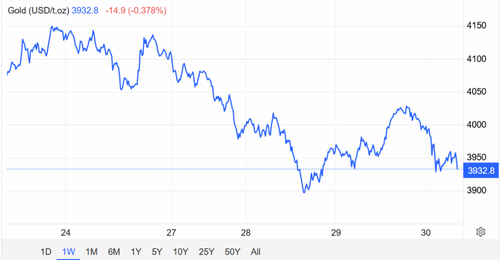 Kết thúc phiên giao dịch ngày 29/10, hợp đồng vàng giao ngay tiến 0,3% lên $3964,39/oz, sau khi tăng tới 2% vào đầu phiên.