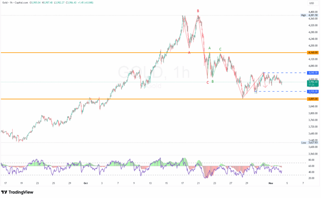 Trên biểu đồ giờ, vàng đang trong giai đoạn điều chỉnh sau khi đạt đỉnh gần 4.380 USD/oz, hiện dao động quanh vùng 4.000 USD. Nếu giá phá vỡ ngưỡng hỗ trợ 3.930 USD, xu hướng giảm có thể mở rộng về 3.885 USD. Ngược lại, việc bứt phá trên 4.040 USD sẽ là tín hiệu đảo chiều, mở ra cơ hội cho nhịp tăng mới.