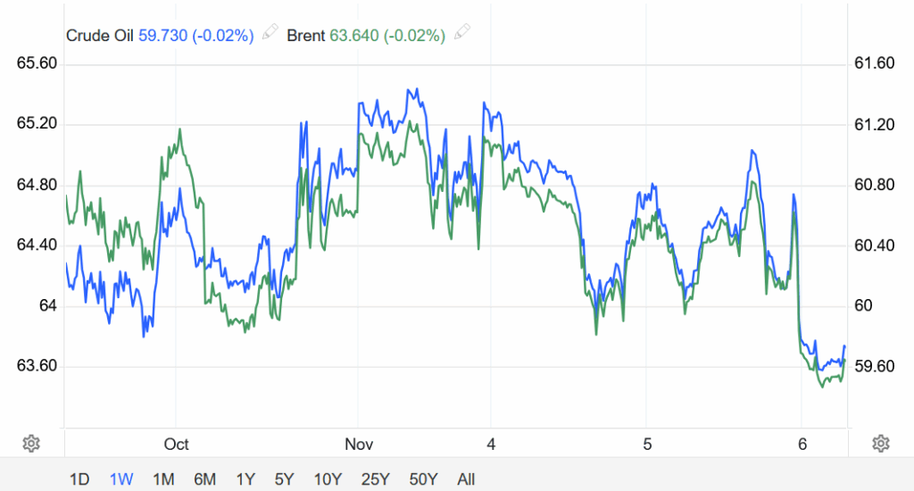 Kết thúc phiên giao dịch ngày 05/11, hợp đồng dầu Brent lùi 92 xu (tương đương 1,43%) xuống 63,52 USD/thùng.