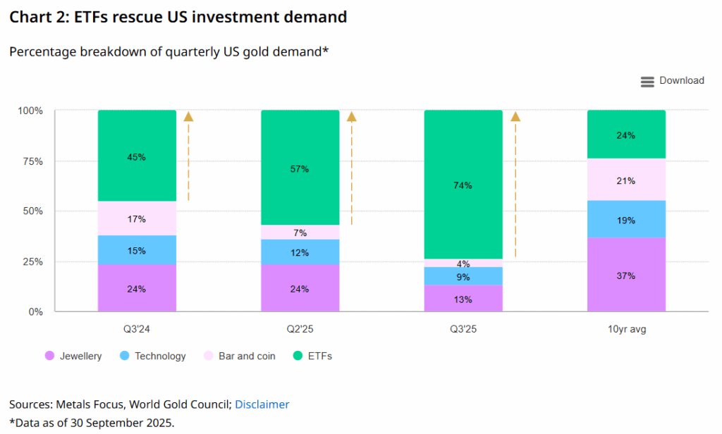 Theo Báo cáo Xu hướng Nhu cầu Vàng Quý III/2025 (Gold Demand Trends Q3) của Hội đồng Vàng Thế giới (World Gold Council – WGC), nhu cầu vàng tại Mỹ tăng mạnh 58% so với cùng kỳ năm ngoái, chủ yếu nhờ dòng tiền khổng lồ đổ vào các quỹ ETF vàng niêm yết tại Mỹ, đạt 16 tỷ USD, cùng với sự bùng nổ trong khối lượng giao dịch.