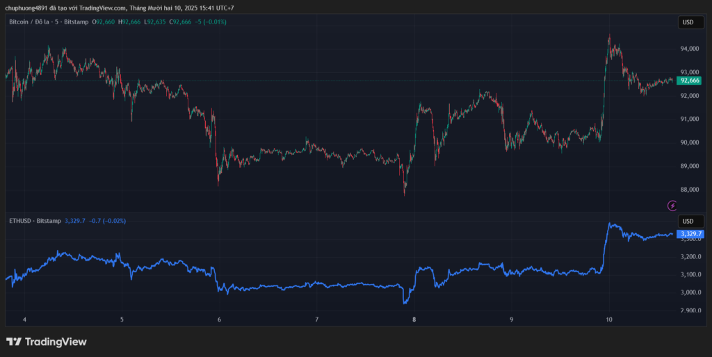 Thị trường tiền kĩ thuật số tăng nhanh rồi hạ nhiệt đôi chút. BTC/USD hiện nằm trên mốc 92.000. ETH/USD quanh mức 3320.