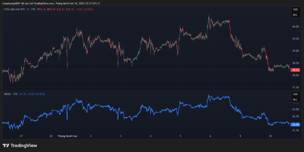 Thị trường năng lượng tiếp tục đi xuống do áp lực cầu yếu. Giá dầu WTI về quanh mốc 58 USD/thùng còn dầu Brent về dưới ngưỡng 62 USD/thùng.