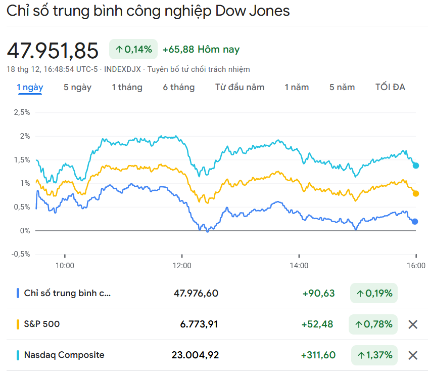 Cùng chiều, chỉ số Dow Jones nhích 65,88 điểm, tương đương 0,14%, đóng cửa ở mức 47.951,85 điểm.