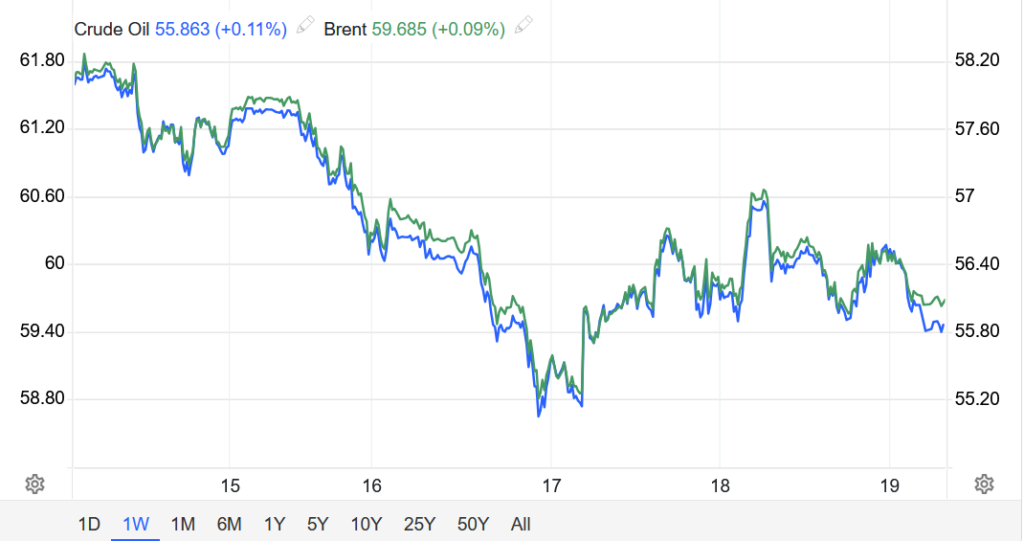 Khép phiên ngày 18/12,giá dầu Brent tăng 14 xu, tương đương 0,23%, chốt phiên ở mức 59,82 USD/thùng.