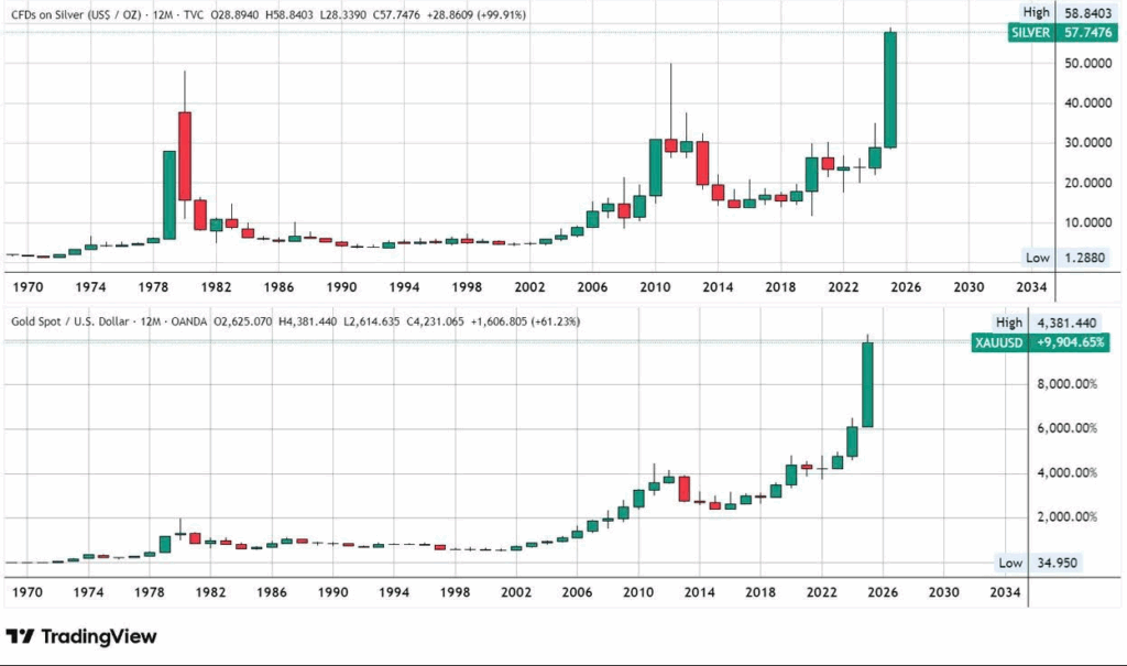 Dù vàng gây ấn tượng với mức tăng gần 95% trong hơn 21 tháng, thì bạc lại tăng gấp đôi chỉ trong 12 tháng. Hiệu suất vượt trội này có thể sớm thu hút dòng tiền chuyển từ vàng sang bạc, tạo hiệu ứng “tự khuếch đại” cho đà tăng trong thời gian tới.